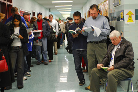 等到孩子們真正長大可以投票的時候,他們在熱情高漲的同時又不乏理性。在呂芳的想像中,投票站應(yīng)該是兩方對壘,支持者搖旗吶喊才對。結(jié)果卻完全出乎他的預(yù)料。大選當(dāng)天,呂芳所在小組參觀的第一個投票點在弗吉尼亞Falls Church縣的一個社區(qū)活動中心。他們到那里時剛過6點,投票點外已經(jīng)排起了長龍,蜿蜒足有一二百米。人群中,有人帶著蹣跚學(xué)步的孩子,有人坐著輪椅,有人自己帶著椅子……“但是,整個人群靜悄悄的,沒有一點激動人心的表現(xiàn)!