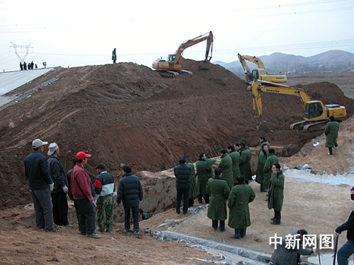 記者23日下午在現(xiàn)場(chǎng)看到,發(fā)生跑水的渠段已被從南北兩側(cè)攔截,有五六輛挖掘機(jī)正在作業(yè),干渠被截開近一丈寬的口子,渠底一條橫貫東西的水泥槽已明顯裸露出來。十幾個(gè)穿綠大衣的人站在截開的渠北側(cè),許多施工人員聚攏周圍。