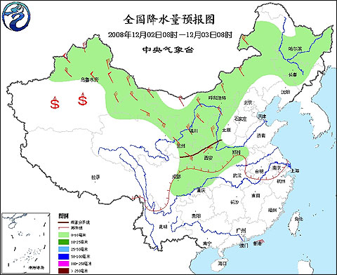 2008年12月2日8時(shí)—12月3日8時(shí)全國(guó)降水量預(yù)報(bào)圖