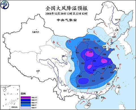 2008年12月20日12時(shí)—22日12時(shí)全國大風(fēng)降溫預(yù)報(bào)圖