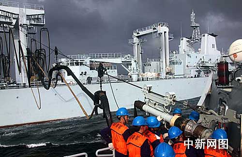 中新社“?凇迸烋R六甲海峽十二月三十日電 (記者 孫自法)中國海軍赴亞丁灣、索馬里海域護航艦艇編隊,三十日下午在馬六甲海峽順利完成首次海上綜合補給。(完)