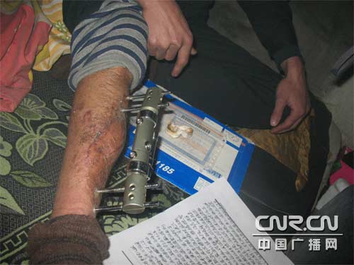 走進(jìn)李權(quán)柱租來的不足10平米的小屋時(shí),屋里彌漫著嗆人的煤煙,但屋里的水缸卻結(jié)了冰。李權(quán)柱和他的愛人蜷縮在炕頭,挽起薄薄的秋褲,記者看到,一個(gè)60公分長的鐵夾深深地嵌進(jìn)李權(quán)柱的小小腿上,皮膚和鐵夾相連的地方還在往外流著膿水,李權(quán)柱就拿紙纏在鐵夾上。