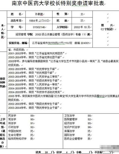 通過(guò)網(wǎng)上一份“南京中醫(yī)藥大學(xué)校長(zhǎng)特別獎(jiǎng)申請(qǐng)審批表”里可以看出,孫靚靚是一個(gè)各方面都很出色的學(xué)生。她從2002年起每個(gè)學(xué)年都是校級(jí)或院級(jí)的優(yōu)秀學(xué)生干部。大學(xué)期間品德方面、學(xué)習(xí)方面、實(shí)踐方面等方面的都很優(yōu)秀。依據(jù)這份申請(qǐng)表,孫靚靚是個(gè)積極參與社會(huì)活動(dòng),同時(shí)也是個(gè)學(xué)習(xí)、生活等都很踏實(shí)的人,因此時(shí)常拿到獎(jiǎng)學(xué)金,還參與編導(dǎo)及演出的該校首部校園DV電影《那一年的青澀》很受好評(píng)。
