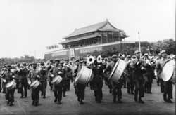 1950年10月1日,中國人民迎來了共和國的第一個生日。500名軍樂隊員在廣場上站立演奏了好幾個小時之后,在總指揮晨耕的指揮下,邁著矯健、整齊的步伐,演奏著激揚、堅定的《中國人民解放軍進行曲》,最后行進通過天安門廣場,接受毛主席檢閱。望著一排排朝氣蓬勃的軍樂戰(zhàn)士,毛澤東主席高興地頻頻揮手,高喊:“人民萬歲!軍樂團萬歲!”隨后轉(zhuǎn)過身來對聶榮臻說:“我們中國這么大,人口這么多,要成立千人軍樂團!