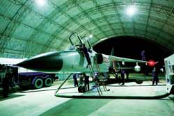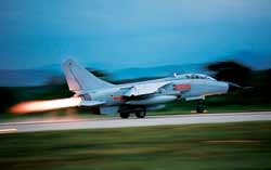 “1號請求起飛!薄鞍从媱潏(zhí)行。”一切準(zhǔn)備就緒后,塔臺指揮員干凈利索地下達(dá)了命令。18時25分,該團(tuán)團(tuán)長李軍第一個駕駛“飛豹”戰(zhàn)機(jī)沖向跑道。頓時,機(jī)場上響起巨大轟鳴聲,震得記者耳朵嗡嗡作響;校恿,起飛,戰(zhàn)鷹閃著亮光騰空而起,噴著橘紅色的尾焰直沖蒼穹,最后消失在茫茫夜色之中。
