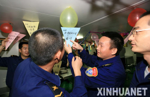 這天晚上是農(nóng)歷新年后的第一個(gè)月圓之夜,人們往往視元宵為新春佳節(jié)的最后一天。為豐富大家的文化生活,編隊(duì)利用護(hù)航間隙組織了一場(chǎng)游園活動(dòng)。地點(diǎn)設(shè)在士兵餐廳和兩個(gè)活動(dòng)室,項(xiàng)目包括蒙眼敲鑼、猜燈謎、釣魚、吹乒乓球、投飛鏢等,獎(jiǎng)品是瓜子、花生等水兵喜愛的小食品。