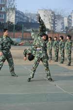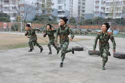 在女子特警隊營區(qū),一隊新入伍的女戰(zhàn)士正在訓(xùn)練。據(jù)陪同我們的隊長王安斌介紹,特警隊擔(dān)負著四川總隊每年的女兵新訓(xùn)任務(wù),女特警隊員就是從這里層層選拔出來的。每年新兵訓(xùn)練結(jié)束時,特警隊通過組織對全體新戰(zhàn)士進行政治思想摸底,文化水平、心理素質(zhì)測試及軍事體育、擒敵技術(shù)、戰(zhàn)術(shù)等科目綜合考核,按照層層選拔、優(yōu)中選優(yōu)的原則,遴選出軍事過硬、素質(zhì)全面的新同志補充到女子特警隊。作為一名女子特警隊員,她們?nèi)腙牶筮必須在心理上、生理上承受常人難以想象的磨礪,經(jīng)過特種戰(zhàn)術(shù)、攀登、射擊、擒敵等20多個科目的訓(xùn)練,過好體能關(guān)、心理素質(zhì)關(guān)、特戰(zhàn)技能關(guān),才能真正實現(xiàn)脫胎換骨的轉(zhuǎn)變,成為一位名符其實的特戰(zhàn)隊員,而這一切都是依靠特殊的訓(xùn)練來實現(xiàn)的。