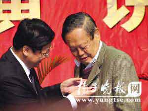 19日,應(yīng)邀參加揚(yáng)州煙花三月經(jīng)貿(mào)旅游節(jié)的世界杰出物理學(xué)家、諾貝爾獎(jiǎng)獲得者楊振寧博士做客揚(yáng)州大學(xué),欣然擔(dān)任該校榮譽(yù)教授,并為師生上了一堂精彩紛呈的“創(chuàng)新課”。臺(tái)上87歲的楊振寧聲音洪亮,妙語(yǔ)連珠;臺(tái)下33歲的楊夫人翁帆和人頭攢動(dòng)的師生一起,自始至終安安靜靜地當(dāng)“聽(tīng)眾”。