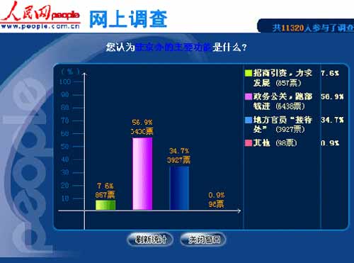 截止4月20日21點,《您認(rèn)為駐京辦主要問題是什么?》共有36079人參與了調(diào)查;在此項調(diào)查中,選項“奢華無度 滋生腐敗”得票最高,為24025票;調(diào)查《您認(rèn)為駐京辦該不該撤銷?》,近九成網(wǎng)友投票認(rèn)為“駐京辦”應(yīng)該撤銷;在調(diào)查《您認(rèn)為駐京辦的主要功能是什么? 》中,有51%的網(wǎng)友認(rèn)為駐京辦的主要功能就是政務(wù)公關(guān),"跑部錢進(jìn)"。