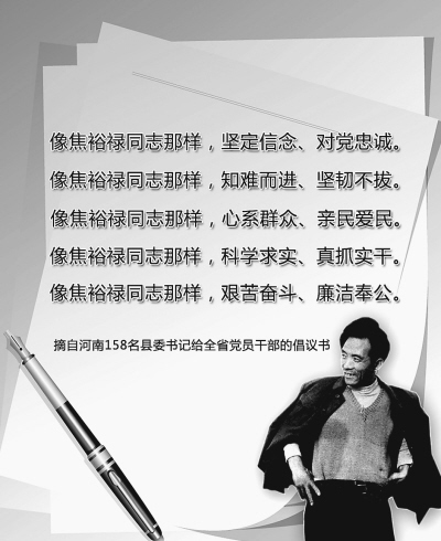 在“縣委書記的好榜樣”焦裕祿同志逝世45周年之際,河南158名縣(市、區(qū))委書記聯(lián)名發(fā)出倡議,要像焦裕祿同志那樣,心系群眾、親民愛民,艱苦奮斗、無私奉獻(xiàn),堅(jiān)持以廉為重、正派做人,不為名利所困、不為物欲所誘、不為人情所擾,真正做到權(quán)為民所用、情為民所系、利為民所謀,爭做焦裕祿式好干部,爭創(chuàng)焦裕祿式業(yè)績。