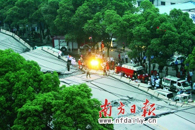 當(dāng)時(shí),數(shù)聲巨響鉆進(jìn)株洲市民李先生的耳朵。辦公室的同事隨即放下手中的工作,擠在窗口急切地想看下面發(fā)生了什么。一位女同事指向紅旗廣場(chǎng)的方向,用驚恐的聲音告訴他們“垮橋了”。李先生放眼望去,垮橋的地點(diǎn),距離他辦公室不過(guò)數(shù)百米的紅旗廣場(chǎng)附近。