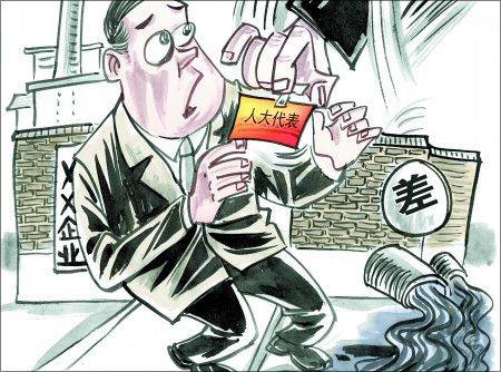 輝縣市有一家造紙廠的負(fù)責(zé)人是新鄉(xiāng)市人大代表,該造紙廠治污設(shè)備長(zhǎng)期閑置,經(jīng)常偷排污水,環(huán)保部門去檢查時(shí),負(fù)責(zé)人總是敷衍,由于其特殊的身份,在當(dāng)?shù)卦斐闪瞬涣嫉挠绊憽_@次對(duì)人大代表調(diào)研評(píng)價(jià)時(shí),環(huán)保部門給其一個(gè)“差”的評(píng)語,這位人大代表再次提名時(shí)沒能通過。