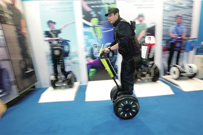在2008年北京奧運會期間,一種可以站著駕駛的兩輪小車給觀眾留下了深刻印象。在此次展會上,這種名叫segway的小車特別推出了警用版。警用版的segway具備視野開闊、機動靈活等特點,一旦發(fā)生突發(fā)事件,特別是在擁堵的路況下,使用segway可以在最短時間內(nèi)到達現(xiàn)場。