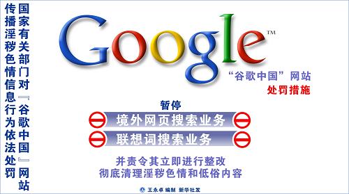 全國整治互聯(lián)網(wǎng)低俗之風(fēng)辦公室19日向媒體透露,國家有關(guān)部門已經(jīng)召見“谷歌中國”網(wǎng)站負(fù)責(zé)人,對該網(wǎng)站大量傳播淫穢色情內(nèi)容進(jìn)行執(zhí)法談話,宣布暫停該網(wǎng)站境外網(wǎng)頁搜索業(yè)務(wù)和聯(lián)想詞搜索業(yè)務(wù),并責(zé)令其立即進(jìn)行整改,徹底清理淫穢色情和低俗內(nèi)容。