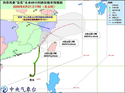 中新網(wǎng)6月21日電 中央氣象臺今天下午六時(shí)發(fā)布臺風(fēng)橙色警報(bào):今年第3號熱帶風(fēng)暴“蓮花”(LINFA)的中心今天下午5時(shí)位于福建省晉江近海海面上,就是北緯24.2度,東經(jīng)118.5度,中心附近最大風(fēng)力有9級(23米/秒)。預(yù)計(jì),“蓮花”將以每小時(shí)15公里左右的速度向偏北方向移動,即將在福建晉江附近沿海登陸,登陸后將沿福建中部沿海地區(qū)向北偏東方向移動,強(qiáng)度將很快減弱。