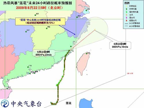 中新網(wǎng)6月22日電 中央氣象臺今天早晨六時發(fā)布臺風消息:今年第3號熱帶風暴“蓮花”(LINFA)已于昨天晚上8時30分前后在福建晉江東石鎮(zhèn)登陸,登陸時中心附近最大風力有9級(23米/秒)!吧徎ā钡顷懞笙虮逼珫|方向移動。今天早上5時風暴中心位于福建省莆田市境內(nèi),就是北緯25.5度,東經(jīng)119.1度,中心附近最大風力有9級(23米/秒)。