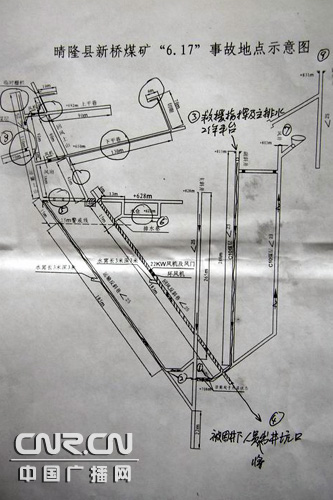 示意圖說明:1為井下排水水倉;2為新儲備水倉;3為救援指揮部及主排水口平臺;4為井下被困人員可能的出井通道;5為井下木料堆積巷道,估計有兩人,水位較低;6為煤礦排水倉,知情人介紹,有事故煤礦礦工固定在此位置排水。7為救援送風口之一;8為人員可能的所在位置,其他畫圈地方為事故發(fā)生時井下被困人員可能存在的地方;9為另一送風口。