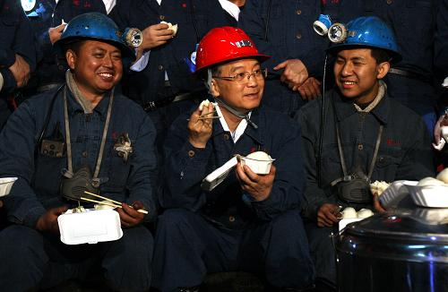 臨近中午12時(shí),從早上7時(shí)就下到礦井里工作的工人們要吃中飯了。在巷道里,溫家寶坐在枕木上與工人們一起用餐。他一邊吃飯,一邊詢問(wèn)工人們的生產(chǎn)生活情況。他對(duì)大家說(shuō),中國(guó)是世界上最大的產(chǎn)煤國(guó),應(yīng)該有世界上最先進(jìn)的礦井、最先進(jìn)的技術(shù)和設(shè)備、最優(yōu)秀的產(chǎn)業(yè)工人。在應(yīng)對(duì)國(guó)際金融危機(jī)時(shí),一定要把煤炭生產(chǎn)搞好。必須正確處理保增長(zhǎng)與安全生產(chǎn)的關(guān)系,任何時(shí)候安全生產(chǎn)都是第一位的,在安全生產(chǎn)中實(shí)現(xiàn)經(jīng)濟(jì)平穩(wěn)較快增長(zhǎng)。同時(shí),要下決定引進(jìn)新技術(shù),大力推進(jìn)清潔生產(chǎn),讓煤炭生產(chǎn)質(zhì)量和效益走在世界的前列。溫家寶在礦井下呆了兩個(gè)小時(shí),才與礦工們惜別。