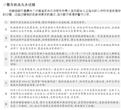 帖子中,伍皓披露云南省政法系統(tǒng)有關(guān)負責(zé)人在聽取調(diào)查進展報告過程中,“用了半個多小時詳細指出公安機關(guān)的過錯”!爱敯盖橹饾u清晰,特別是查出劉家的兩個女兒互換衣服、故意誘導(dǎo)聯(lián)防抓錯人以實施敲詐的情節(jié),基層公安機關(guān)都覺得松了一口氣,有人在匯報中說‘看來案子并沒有辦錯’,有關(guān)負責(zé)人立即怒目圓瞪、厲聲喝斥,‘什么沒有辦錯!這個案子,我們公安機關(guān)是有過錯的’!”