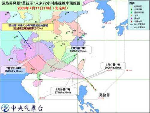 受“莫拉菲”及其外圍云系的影響,17日晚上到18日白天,東海南部海面、巴士海峽、巴林塘海峽、臺灣海峽、臺灣以東洋面、南海北部和東部海面、臺灣省及其沿海、福建沿海、廣東東部沿海將有 7-9 級大風,“莫拉菲”中心經過的附近海面的風力可達 10-12 級。臺灣大部、福建東南部 、廣東東南部將有大到暴雨,其中臺灣東部和南部的部分地區(qū)有大暴雨或特大暴雨。