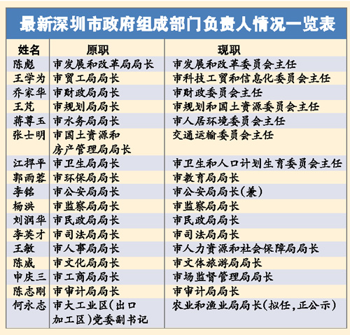 具體是,繼續(xù)留任的5人:李銘留任深圳市公安局局長;楊洪留任市監(jiān)察局局長;劉潤華留任深圳市民政局局長;李英才留任深圳市司法局局長;陳志剛留任深圳市審計局局長。