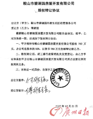 這名網(wǎng)友提供了部分圖片證據(jù),從圖上能看到,在2007年12月21日簽署的鞍山碧湖園房屋開發(fā)有限公司股權(quán)轉(zhuǎn)讓協(xié)議上,出讓方簽名付維強(qiáng),受讓方簽名為傅維強(qiáng)。網(wǎng)帖還貼出當(dāng)?shù)嘏沙鏊_具的證明,證實(shí)付維強(qiáng)在2006年2月21日改名為傅維強(qiáng)。