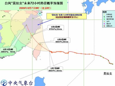 中新網(wǎng)8月7日電 中央氣象臺7日10時發(fā)布臺風紅色警報:今年第8號臺風“ 莫拉克 ”( MORAKOT)今天上午10 時位于我國臺灣省基隆市東南方向大約 180 公里的海面上,就是北緯23.7度、東經(jīng)122.9度,中心附近最大風力有13級(40米/ 秒。