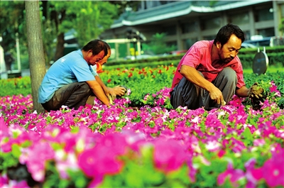 昨天,在交通部對(duì)面的綠化帶里,20多位園林綠化工人正在修剪枝椏,空地上擺滿了小花盤,紅黃綠紫,顏色多樣,引來眾多市民觀看。市園林綠化局透露,根據(jù)國慶60周年北京花卉景觀布置規(guī)劃,全市將布置各類花卉共達(dá)4000萬盆。其中,天安門廣場(chǎng)將在十一期間設(shè)置一組中心花壇,長安街沿線步道將布置22處立體花壇,面積達(dá)十萬余平米。其中,天安門廣場(chǎng)中心花壇作為主花壇,現(xiàn)暫定將安排在天安門中心廣場(chǎng)偏南10米的位置,呈圓形,突出“普天同慶”的主題;▔睆綄⑦_(dá)40米,中心主花籃高達(dá)13米,將選用真假花卉結(jié)合的方式,主選花種有粉矮牽;ā⑿↑S菊等。市園林綠化局負(fù)責(zé)人表示,主花壇的設(shè)計(jì)和布置還未最終確定,將在國慶游行排練之后,按實(shí)際需要做相應(yīng)的修改和調(diào)整。