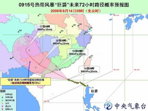 中新網(wǎng)9月14日電 中央氣象臺今日06時發(fā)布臺風(fēng)橙色警報:今年第15號熱帶風(fēng)暴“巨爵”(Koppu ,名字來源于日本,指巨爵星座)的中心今天早晨 5 時位于廣東陽江東南方大約 480 公里的南海北部海面上,就是北緯20.1度、東經(jīng)116.2度,中心附近最大風(fēng)力有9級(23 米/秒)。