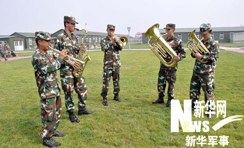 進(jìn)駐閱兵村后,為豐富官兵文化生活需要,方隊(duì)緊急組建了這支小型軍樂隊(duì),配備了大小號(hào)、長圓號(hào)、大小軍鼓等各種管弦和打擊樂器。雖然樂隊(duì)成員只有10人,卻個(gè)個(gè)藝精才高。他們有的畢業(yè)于藝術(shù)學(xué)校,民樂、西洋管樂樣樣皆通;有的來自嗩吶世家,"童子功"相當(dāng)深厚;還有的是國家一級演員的弟子,快板說得頭頭是道……個(gè)個(gè)都是方隊(duì)的文藝骨干。這支軍樂隊(duì)也成了方隊(duì)的文藝演出小分隊(duì)。