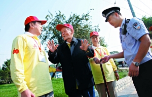 “奧運會舉行時,傅老就是治安志愿者!蔽鞑菔猩鐓^(qū)民警趙亮說,今年一聽說國慶安保也需要志愿者,傅漪泉老人一早兒就報名參加了。為了照顧老人身體,民警都沒給他固定崗位,但“老人常主動在胡同里轉(zhuǎn)!壁w亮還表示,去年除夕傅漪泉老人夜里12點出來巡邏,發(fā)現(xiàn)西草市社區(qū)148號附近的堆積物上有火苗,趕緊回去告訴家人。家人立即通知趙亮處理,避免了一場火情。
