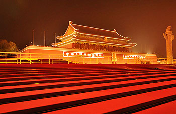 開國大典上臨時搭起的兩座觀禮臺是磚木結構的建筑,此后一直沿用,直到1954年6月,為了滿足國慶觀禮的需要,國家將這兩座磚木結構臨時觀禮臺改建成磚混結構的永久性觀禮臺,使用面積達2470平方米。1959年,又在此基礎上銜接成永久性的觀禮臺。