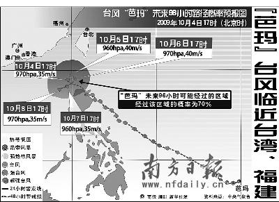 雖然“芭瑪”5日將繼續(xù)在南海東北部回旋少動,強度變化不大,但由于明天是農(nóng)歷八月十八,天文大潮受“芭瑪”和南下冷空氣的共同影響,5日白天至夜間,巴士海峽、巴林塘海峽、臺灣海峽、南海東北部和中部偏東海域及臺灣恒春半島將有7~9級大風,部分海域和地區(qū)陣風可達10~11級,“芭瑪”中心經(jīng)過的附近海域的風力有10~12級,陣風可達13~14級;東海、臺灣以東洋面、臺灣省沿海(除恒春半島外)、浙江沿海、福建沿海、廣東東部沿海也將有6~8級大風,部分海域或地區(qū)陣風可達9~10級;臺灣大部將有大到暴雨,其中臺灣東北部和臺灣恒春半島的部分地區(qū)有大暴雨。