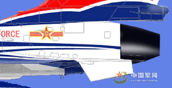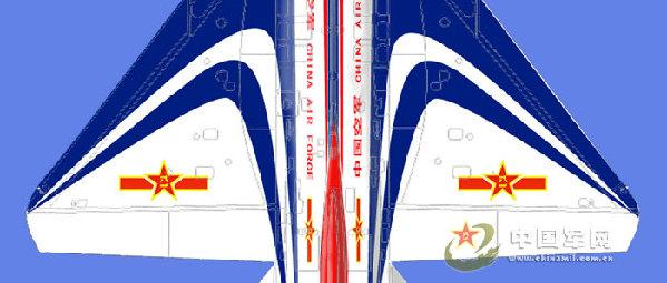 殲-10表演機(jī)的機(jī)徽與空軍軍機(jī)機(jī)徽相同,為軍徽兩邊襯一鑲有對(duì)稱(chēng)的金黃色等邊的紅帶,中間嵌金黃色“八一”二字,“八一”為宋體漢字。噴涂在機(jī)身后部左右兩側(cè)、左右機(jī)翼上表面,共4處(見(jiàn)圖7、8、9)