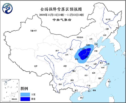中新網11月11日電 中央氣象臺11日10時發(fā)布暴雪橙色警報:受冷暖空氣的共同影響,預計今天下午到明天中午,陜西中部、山西中南部、河北中南部、河南北部和西部、湖北西北部、山東西北部等地有大雪,其中,陜西中部的局部地區(qū)、山西南部、河北南部、河南北部等地有暴雪,降水量一般有8~16毫米,局地達20毫米以上。