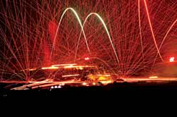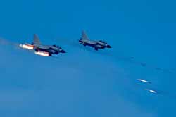 記者在演習(xí)現(xiàn)場(chǎng)看到,在某高地的爭(zhēng)奪戰(zhàn)中,紅藍(lán)雙方拼得異常激烈。拂曉剛過,“藍(lán)軍”15架飛機(jī)從多個(gè)方向同時(shí)出現(xiàn)在“紅軍”空域,準(zhǔn)備對(duì)“紅軍”目標(biāo)同時(shí)發(fā)起攻擊。“紅軍”毫不示弱,偵察飛機(jī)主動(dòng)出擊,出其不意地對(duì)敵情報(bào)預(yù)警系統(tǒng)實(shí)施欺騙性干擾,與此同時(shí),“紅軍”空中攔截兵力強(qiáng)行突防飛抵目標(biāo)上空,朝敵機(jī)猛撲過去,為奪取局部制空權(quán),與敵機(jī)展開了一場(chǎng)生死大戰(zhàn)。瞬間,方圓數(shù)百公里的戰(zhàn)場(chǎng)陡然升溫。爾后,“紅軍”空中轟炸機(jī)群多批次、多架次、不間斷對(duì)敵縱深目標(biāo)進(jìn)行持續(xù)轟炸,使敵指揮機(jī)構(gòu)、通信樞紐等重要目標(biāo)遭到癱瘓性打擊。