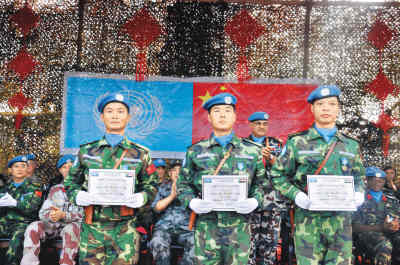 在國際維和戰(zhàn)場上,中國維和軍人還充當(dāng)了“文化使者”。在蘇丹,維和軍人長期把紅燈籠、中國結(jié)、四大發(fā)明和文房四寶的招貼畫等放在營區(qū)展示,還利用國慶招待會、新春招待會、授勛、迎奧運(yùn)多國運(yùn)動會等時(shí)機(jī),播放反映中國人文風(fēng)情、改革開放成果的宣傳片。