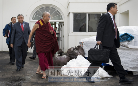 華盛頓的積雪還未融化,就在后門邊上,幾個黑色大垃圾袋鼓鼓囊囊地挺立著。身著藏服的達賴不得不暫時卸下臉上的喜色,小心翼翼地從路面上繞行過去。