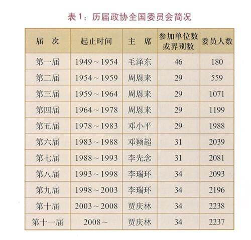 政協(xié)全國委員會每屆任期五年,設主席、副主席若干人、秘書長。歷屆政協(xié)全國委員會簡況如表1。