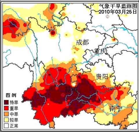 3月25日氣象干旱監(jiān)測顯示,云南、貴州西部和南部、廣西西部和北部、川西高原南部等地存在中度以上氣象干旱;其中云南大部、貴州西南部、廣西西北部、川西高原南部等地存在重度以上氣象干旱。
