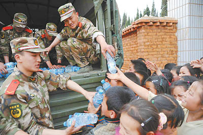 每桶水都有八九十斤重,剛搬了幾桶全身就濕透了,好多戰(zhàn)友都脫下衣服干活兒。太陽(yáng)很毒,每天我們都要暴曬十來(lái)個(gè)小時(shí),加上塑料桶的摩擦,大家的身上不是被曬暴皮,就是被桶磨破了。這幾天不時(shí)還要出去撲救山火。這樣一來(lái),暴皮的地方出現(xiàn)了不少水泡,稍碰一下就特別疼。有的戰(zhàn)友一狠心,干脆把水泡扎破了。