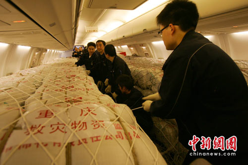 截至15日17時(shí),中共重慶市委、市政府組織的第二批救災(zāi)物資已經(jīng)運(yùn)抵重慶機(jī)場,由國航重慶分公司的波音737-800執(zhí)行飛行任務(wù)準(zhǔn)備運(yùn)往災(zāi)區(qū)。而重慶機(jī)場已在下午開始對(duì)首批救援物資進(jìn)行裝載,包括1萬床棉被、2500件棉大衣、3130件防寒服、500件兒童羽絨服、20件應(yīng)急燈和160臺(tái)發(fā)電機(jī)等。完