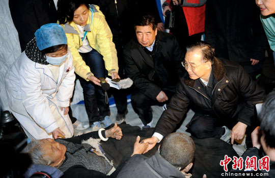 溫家寶是于今日下午6時(shí)乘專機(jī)抵達(dá)青海玉樹的,隨即他乘車前往地震災(zāi)區(qū),察看災(zāi)情,看望慰問(wèn)救災(zāi)群眾,指導(dǎo)抗震救災(zāi)工作。