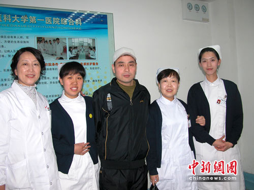 山大一院綜合科的病房里和走廊間,出院的工友們與醫(yī)護人員依依道別。