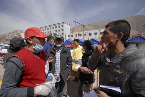 他的名字叫高樹友。在現(xiàn)場(chǎng)負(fù)責(zé)招募志愿者的玉樹團(tuán)州委干事扎西告訴我,地震發(fā)生后幾小時(shí),滿身是土的高樹友跑來了,找到我們要求當(dāng)志愿者!爱(dāng)時(shí)現(xiàn)場(chǎng)還很亂,我們隨便找了一張紙,高樹友寫下了第一個(gè)名字”,扎西從桌上拿出一個(gè)寫滿名字的紙說:“就是這樣的紙,現(xiàn)在已經(jīng)寫滿幾十頁,有400多人報(bào)名了,地震當(dāng)天有30多個(gè)。高樹友不僅是第一個(gè)報(bào)名,而且?guī)椭覀兘M織志愿者,這個(gè)招募點(diǎn)就是我們一起搭起來的!