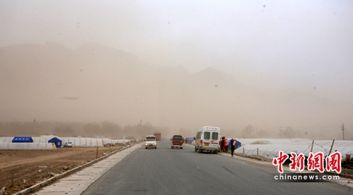 中新網青海玉樹4月19日電(記者劉忠俊)19日,青海玉樹地震災區(qū)的天氣可以說是一天多變,大風狂暴吹起地上塵土,天地一片昏暗。不到幾分鐘又下小雨,過后又出大太陽。大風造成災民以及救援隊的一些帳篷被吹倒,一醫(yī)療點的兩帳篷被大風吹到20米外,造成帳篷里的兩位醫(yī)生和一名記者受傷,其中記者傷得不輕。