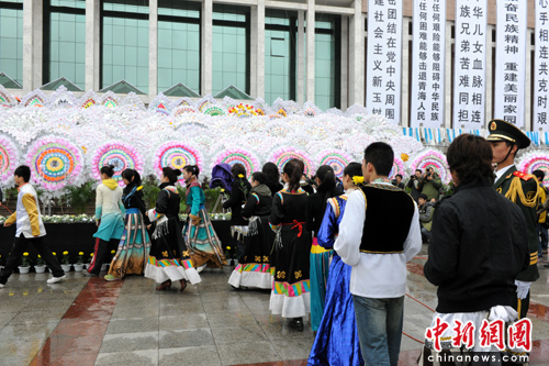10時(shí)15分開(kāi)始,現(xiàn)場(chǎng)民眾排隊(duì)向地震遇難者敬獻(xiàn)鮮花,哀樂(lè)響起,來(lái)自西寧虎臺(tái)中學(xué)的孩子們久久不愿離去。學(xué)生們一遍又一遍地唱響國(guó)歌,一次又一次地喊起“青海加油!玉樹(shù)加油!”