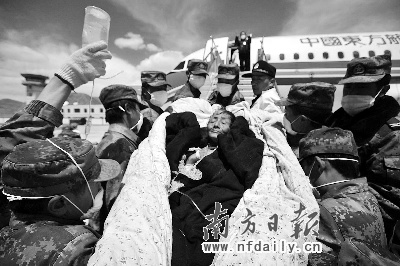 愛(ài)從四面八方向玉樹延伸。聽(tīng)到一聲令下,所有救援力量頃刻出動(dòng)。人力、財(cái)力、物力像潮水一般涌向?yàn)?zāi)區(qū)。
