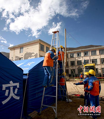中新網(wǎng)青海玉樹4月21日電(夏江 記者劉忠俊)今晚,我終于可以看書學(xué)習(xí)了!紅旗小學(xué)6歲的青梅拉措拉著媽媽的手高興地說。青海玉樹4.14地震發(fā)生以來,玉樹州最大的小學(xué)紅旗小學(xué)就停止了供電,經(jīng)過四川省電力公司抗震救災(zāi)搶險(xiǎn)隊(duì)員的努力,玉樹紅旗小學(xué)全面恢復(fù)供電。