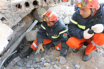 國家救援隊在到達(dá)玉樹機(jī)場后,救援隊員火速前往受災(zāi)最重的玉樹縣城結(jié)古鎮(zhèn)。全體救援隊員挑燈夜戰(zhàn),齊心協(xié)力營救出2名幸存者。雖初戰(zhàn)告捷,但救援隊員不敢絲毫松懈,因為廢墟還有更多生命等待我們。只要有一線希望,我們就會盡百倍努力,“不拋棄,不放棄”。